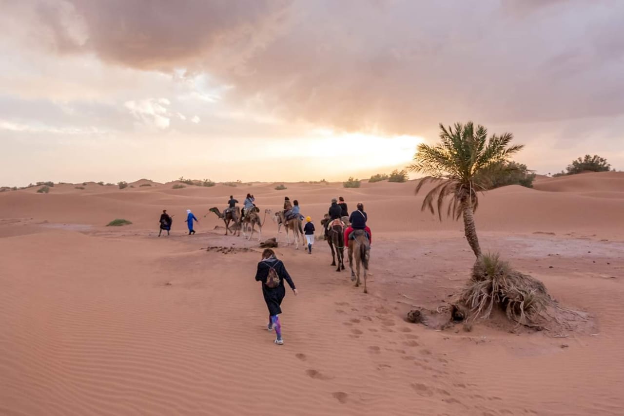 After breakfast, an hour’s ride on camel, then departure by 4×4 by a sandy track to the dunes of Chegaga, the largest in Morocco. Lunch in the shade of palm or tamarisk. Resumption of the track direction Chegaga. Arrival at the desert Bivouac Chegaga to attend an unforgettable sunset. Dinner and overnight in tents or under the stars. Accompanied by musicians and animation.